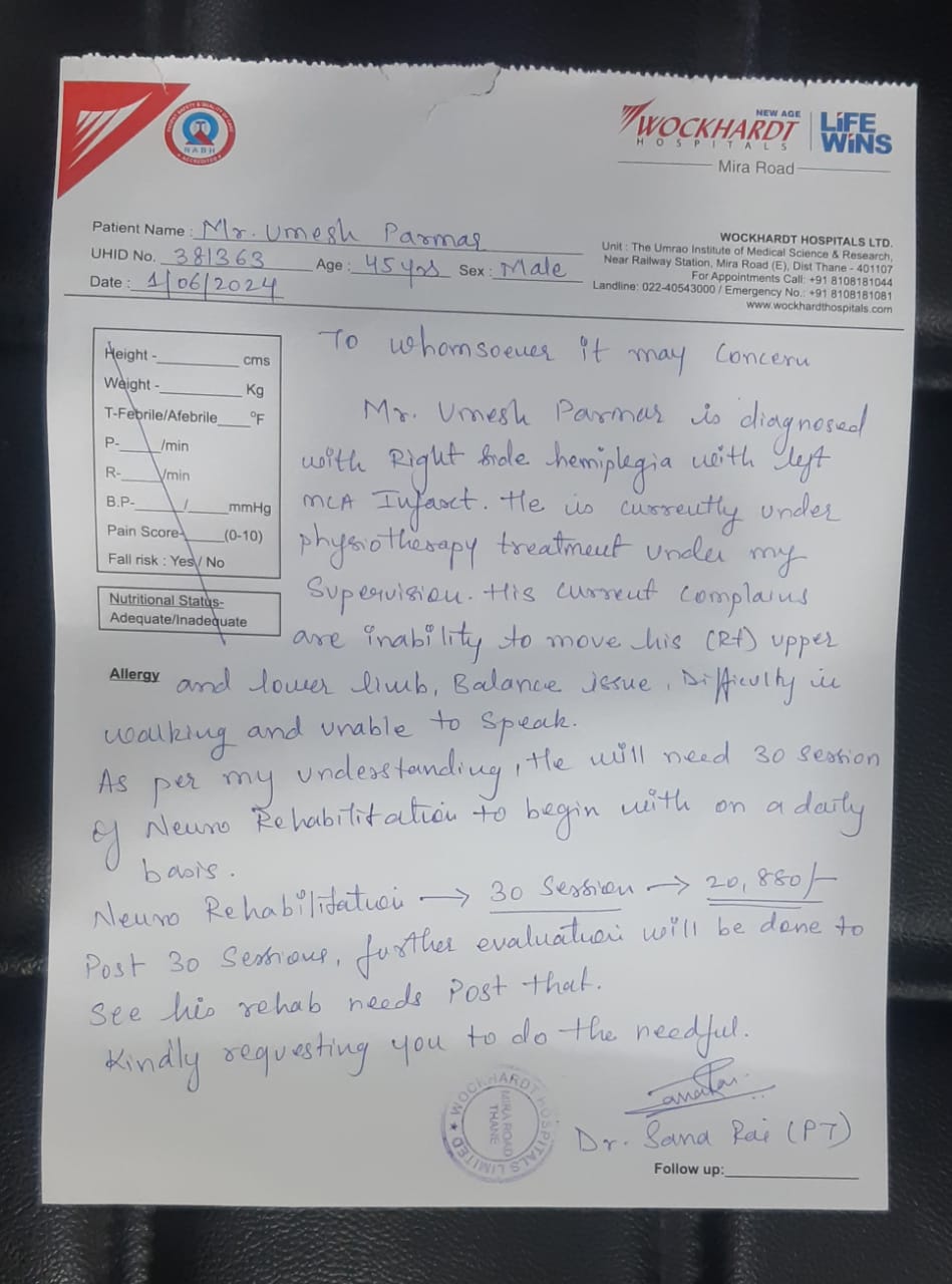 We are reaching out once again to request your support for one more month of treatment. Your contributions will help Umesh achieve the goal of walking independently, providing him with a chance for a better life.