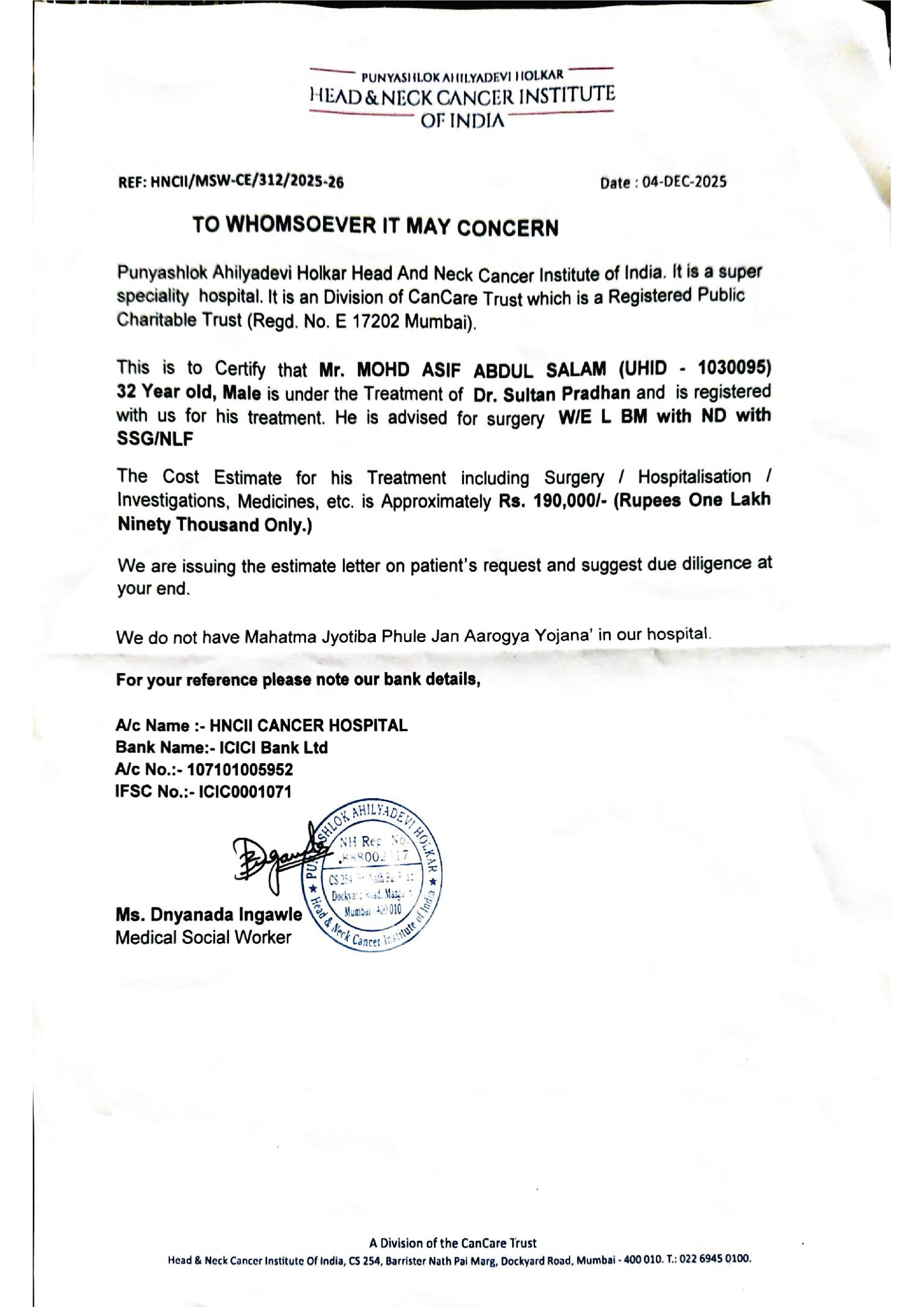 - Let us stand together and help Mohd Asif win his fight against cancer.