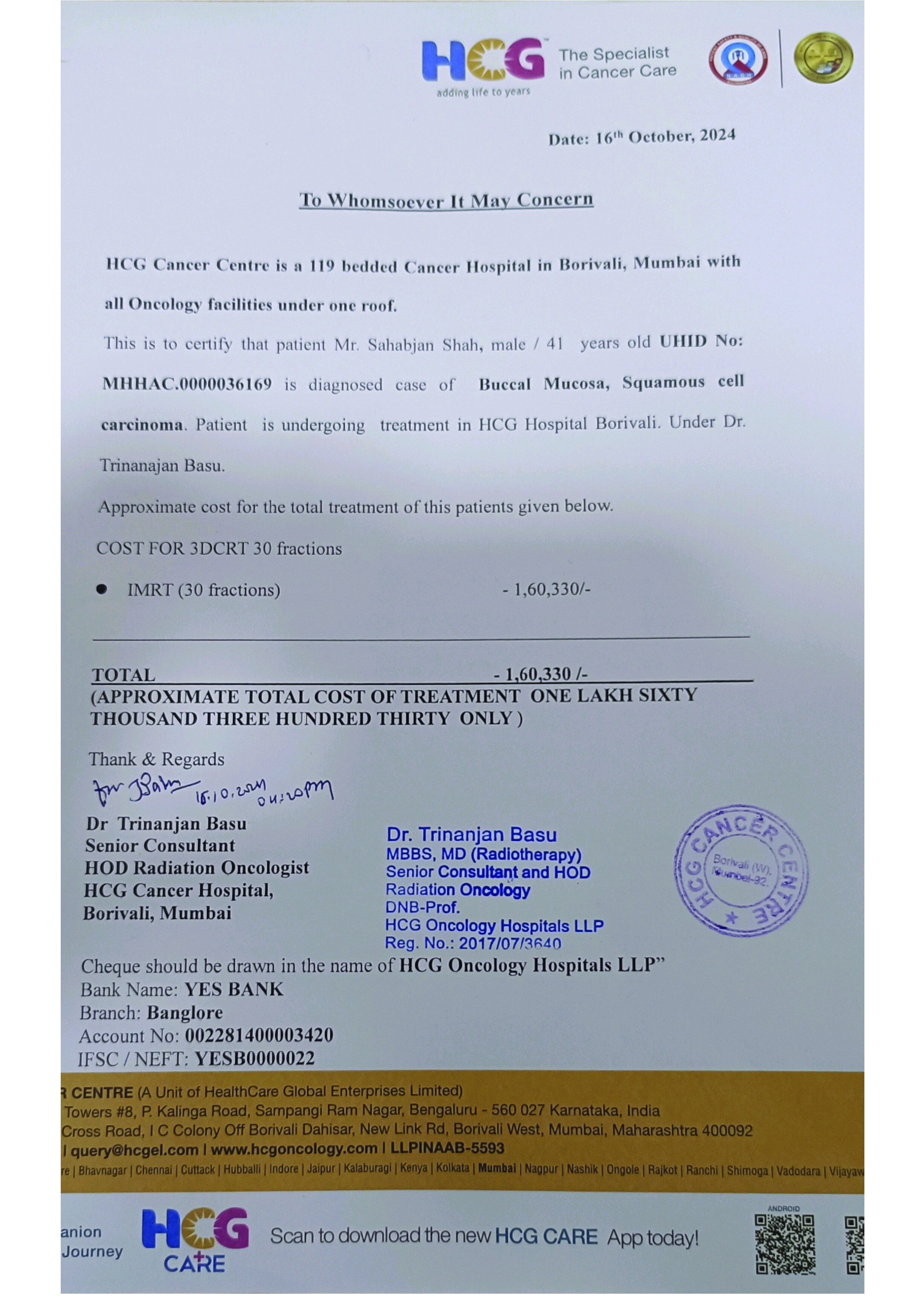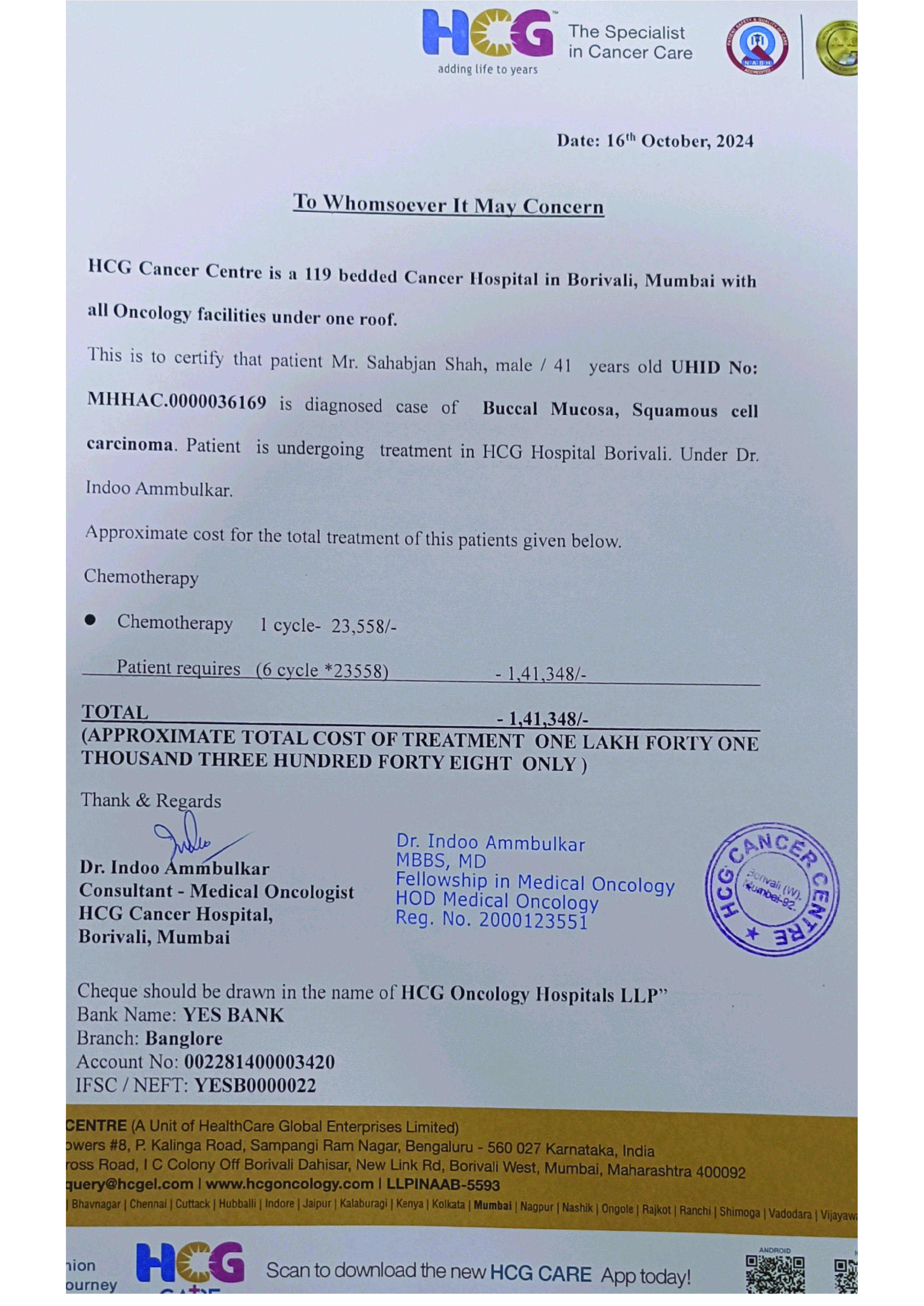 - The cost of Sahbjan's remaining treatment is daunting, amounting to approximately 3,01,678 rupees. As a labour worker, this expense is beyond his means, putting his health and recovery at risk.
