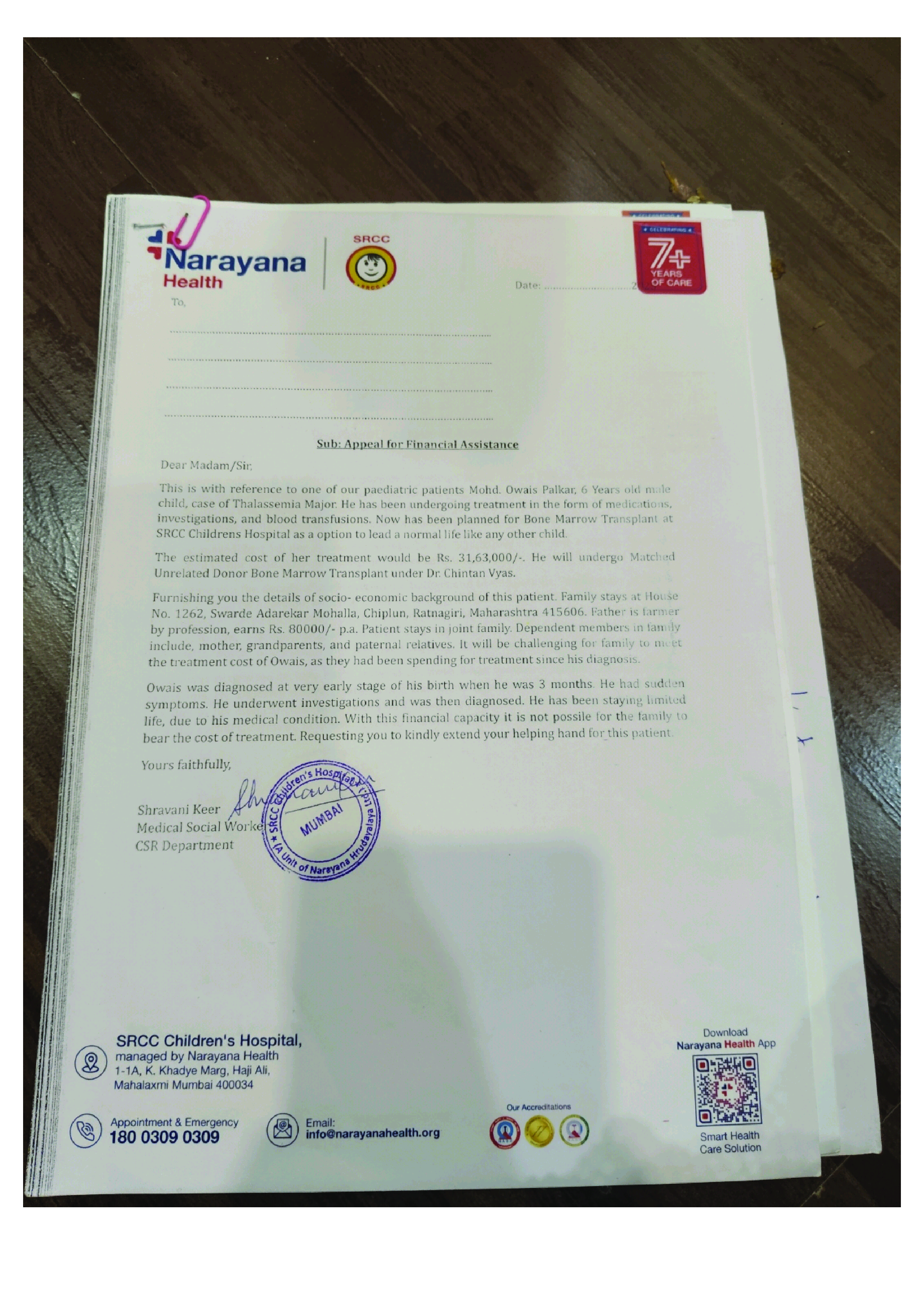 - Doctors have advised a Bone Marrow Transplant, costing ₹31,63,000.
